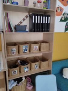 ロッカー、整理かごに自分の写真が貼ってあります。